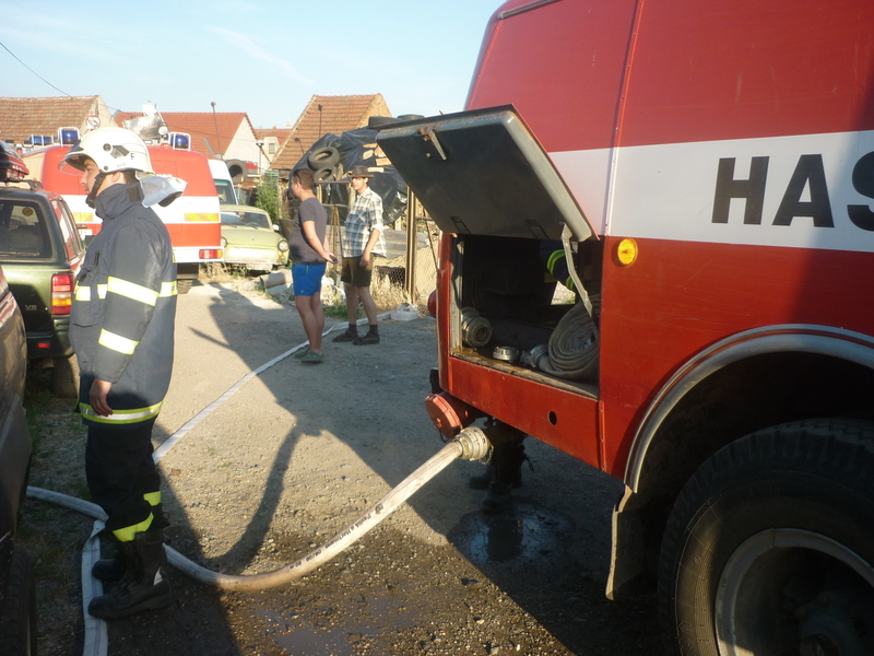 Letošní suché léto se i v naší obci zapsalo vyšším počtem výjezdů. Požáry byly naštěstí jenom malého rozsahu. Ale za to mimořádná událost, která postihla bytový dům nám dal pořádně zabrat. Nejvíce na poničené střeše pracovali Pavel Urban, Vlasta Vlasák, Pavel Čech, Adam Zeman a Michal Hrubý, ale i ostatní, kteří jim pomáhali zespodu.