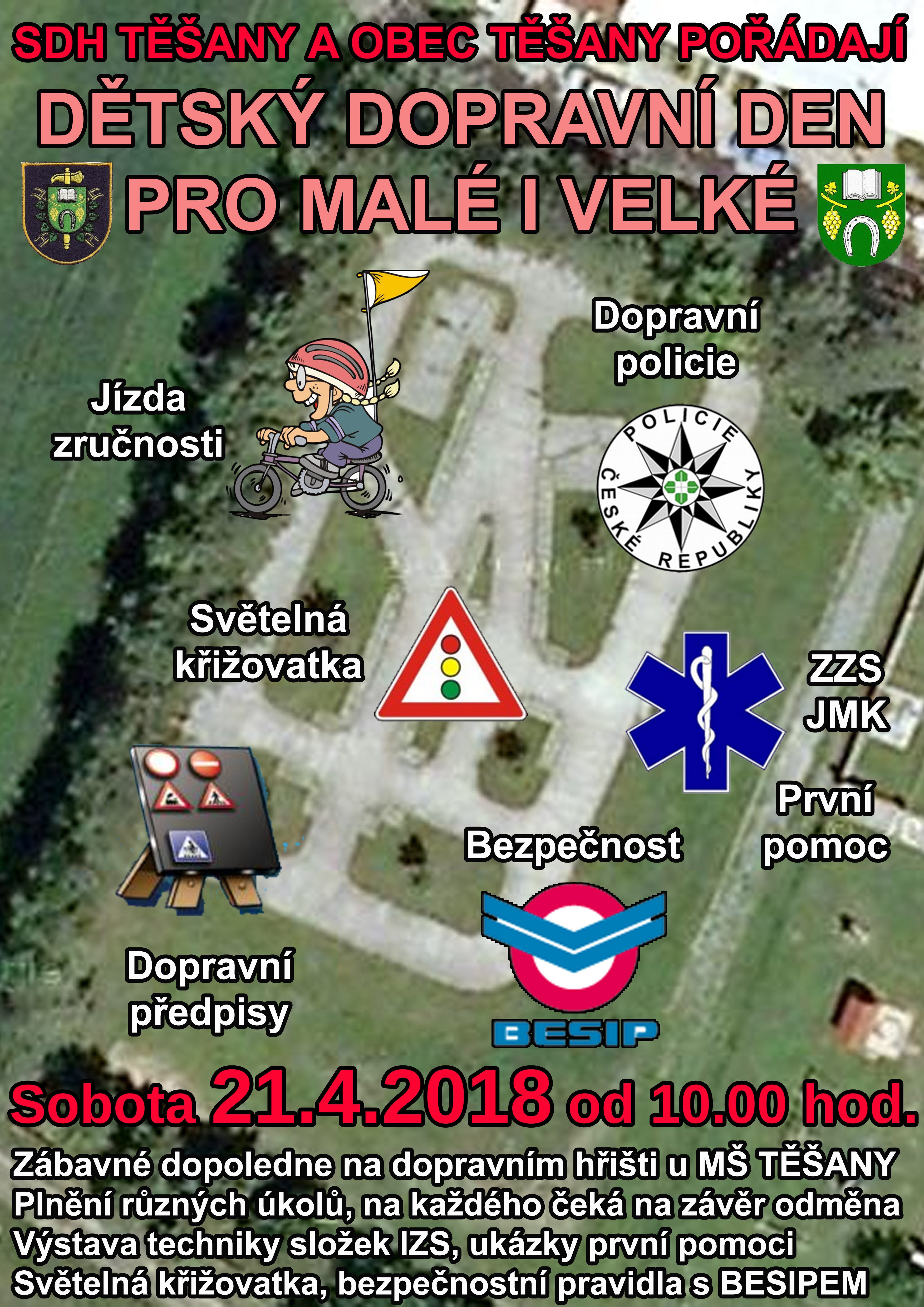 Zveřejněno 11.04.2018SDH Těšany pořádá dětský dopravní den pro malé i velké. V sobotu 21.4. přijeďte na kole, koloběžce, šlapadle i odrážedle zjistit jak se bezpečně chovat v provozu nejen v Těšanech. Navštíví nás preventisté PČR, BESIP, hasiči a můžete se také těšit na zajímavé reflexní odměny!