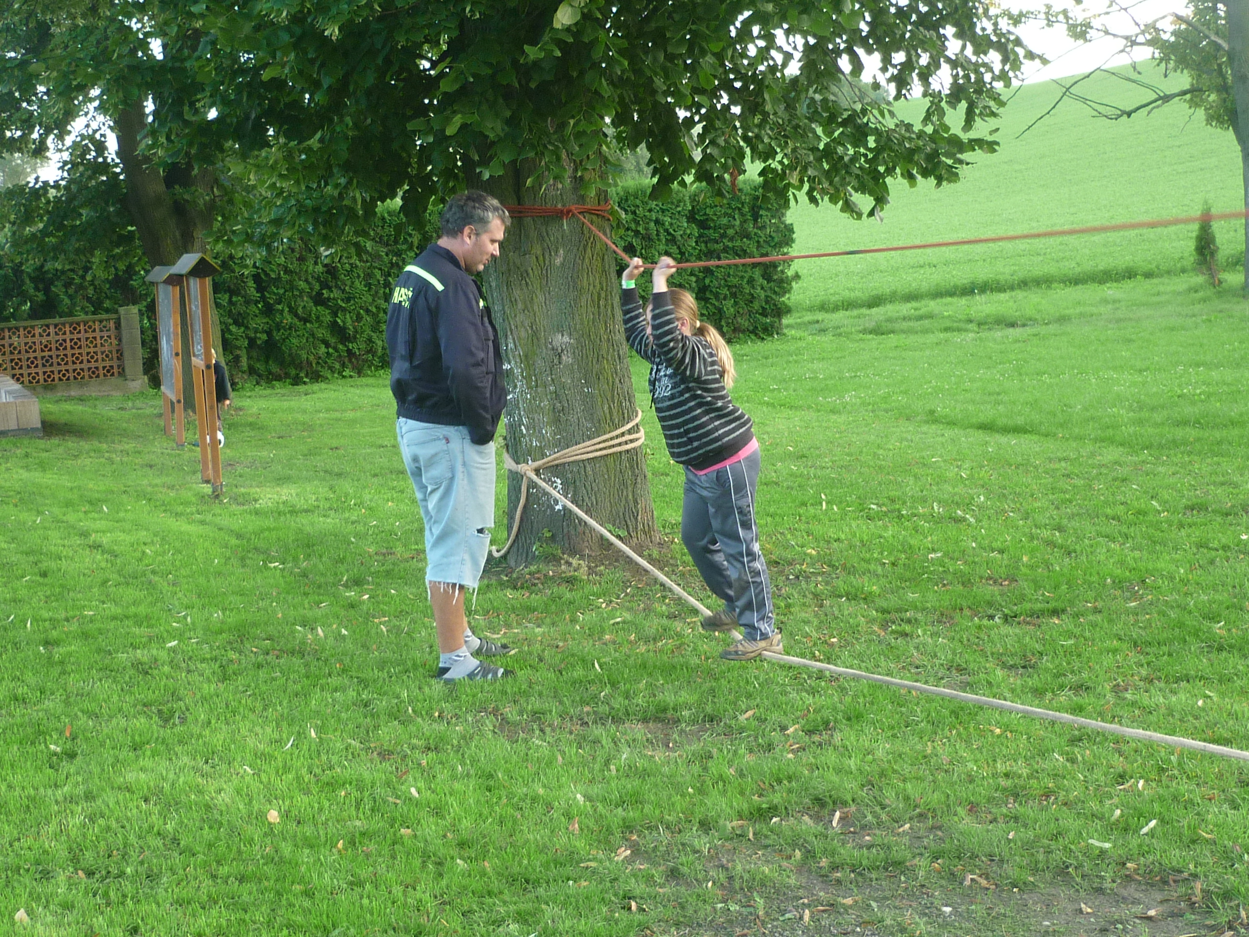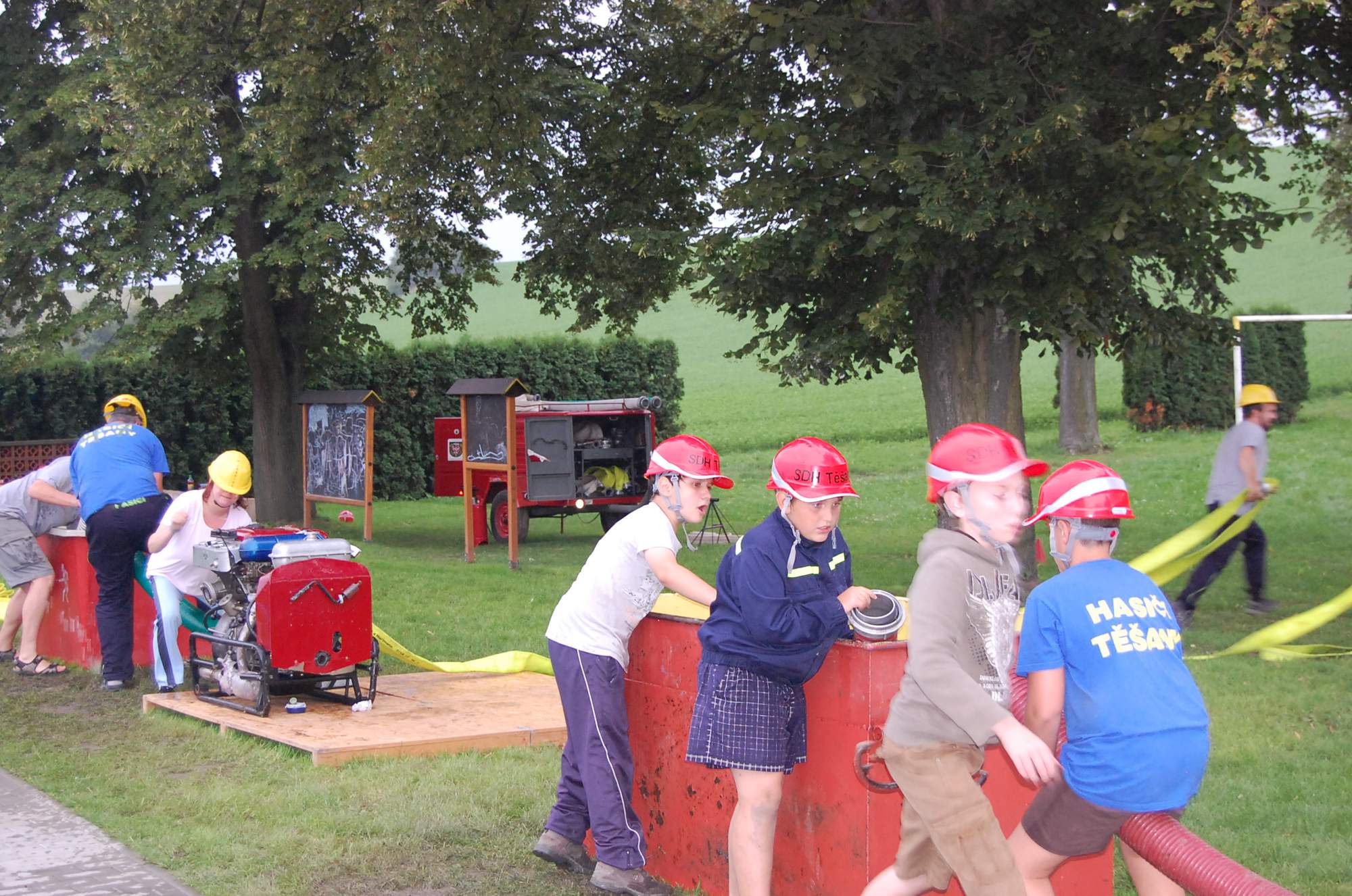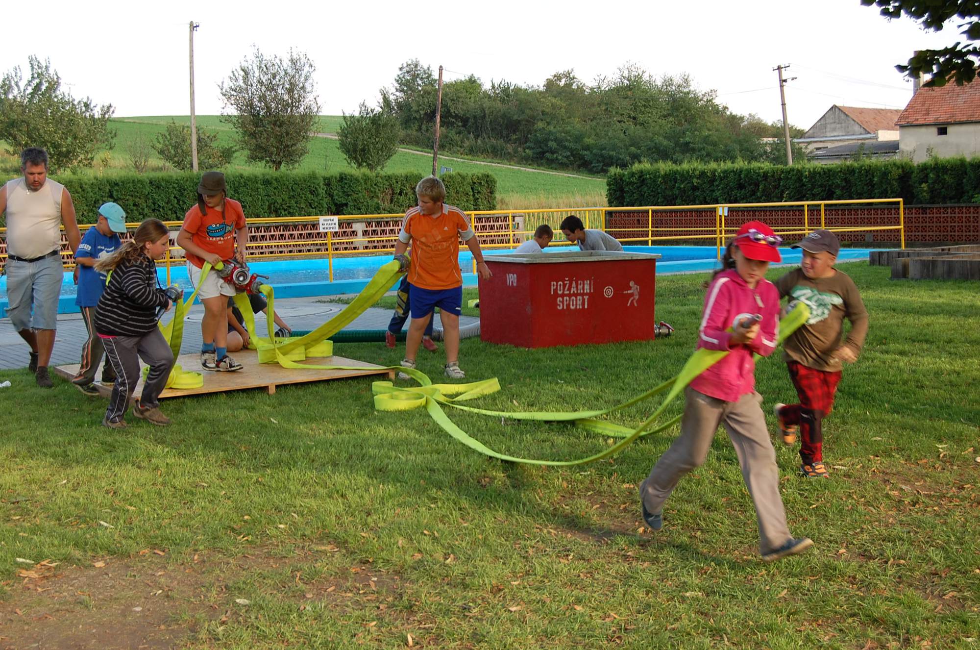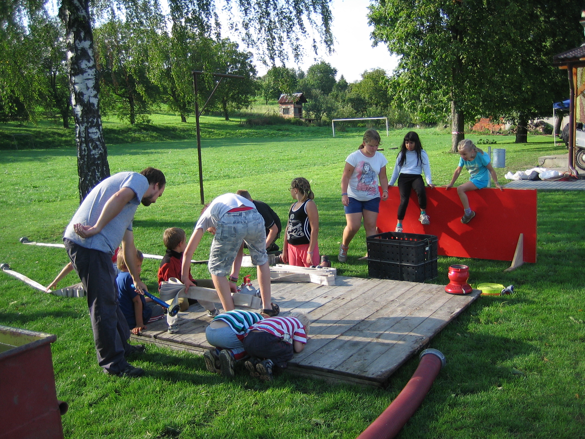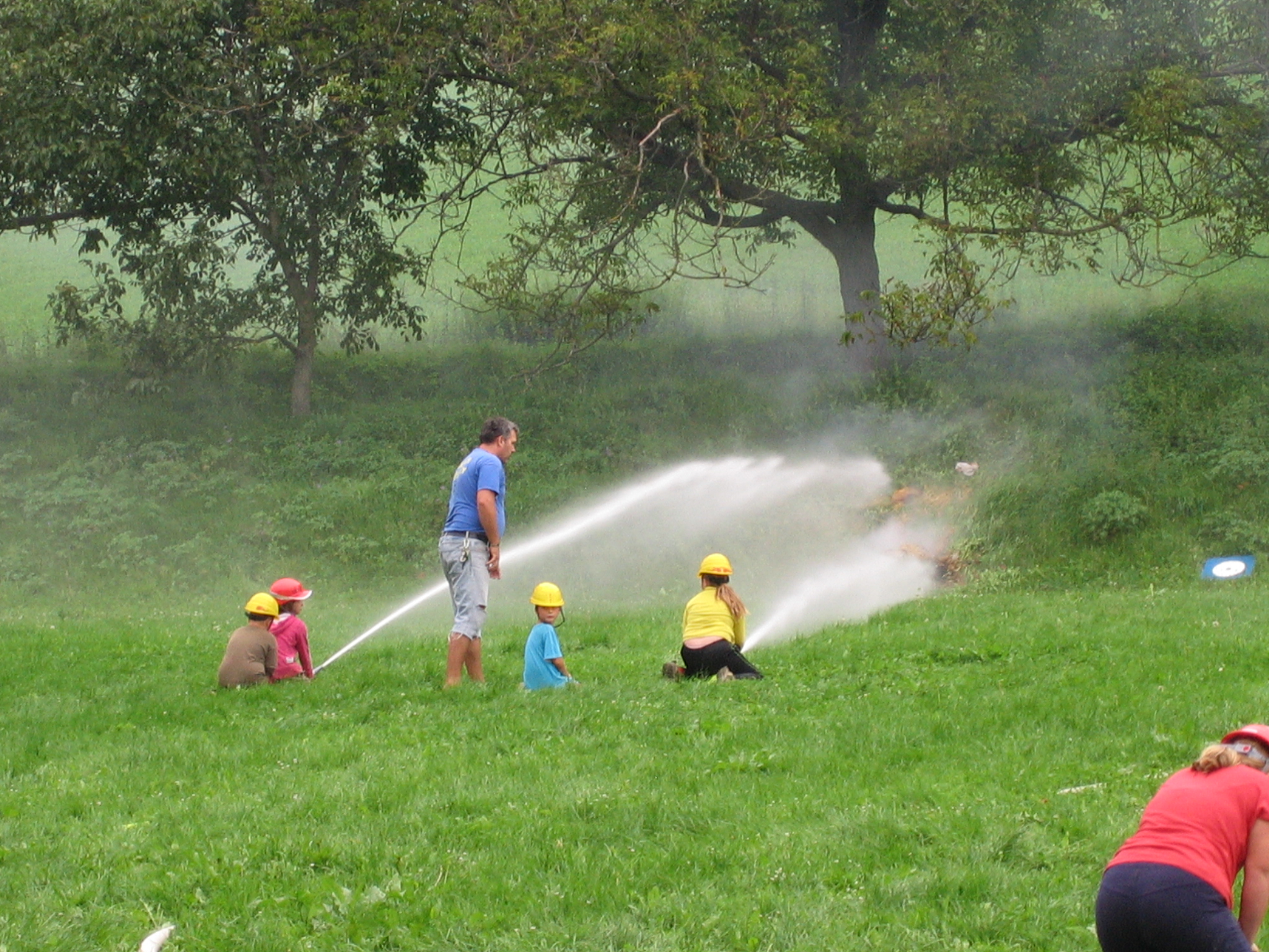 V sobotu - čtvrtý den soustředění - jsme spolu s místními mladými hasiči připravili různé soutěže děti - byl to den rozloučení s prázdninami. Samosebou jsme se soutěží i účastnili. Vyzkoušeli jsme si ještě chůdy, hod na hasiče, hašení domečku, opičí dráhu, závody v pytlích a spousty dalších her. Někteří z nás ale dopoledne trávili trochu jinak - jistě zajímavým výletem po okolí, neboť se museli jen pomocí buzoly vrátit do areálu z místa, kam byli odvezeni se zavázanýma očima. Večerní šou s tancem trochu hatil vytrvalý a hustý déšť, který byl ovšem nádherným tichým doprovodem posledního velkého zážitku soustředění - noční stezky odvahy. Všichni - i ti nejmenší - stezku zvládli na výbornou a sladké odměně v cíli následoval klidný spánek.