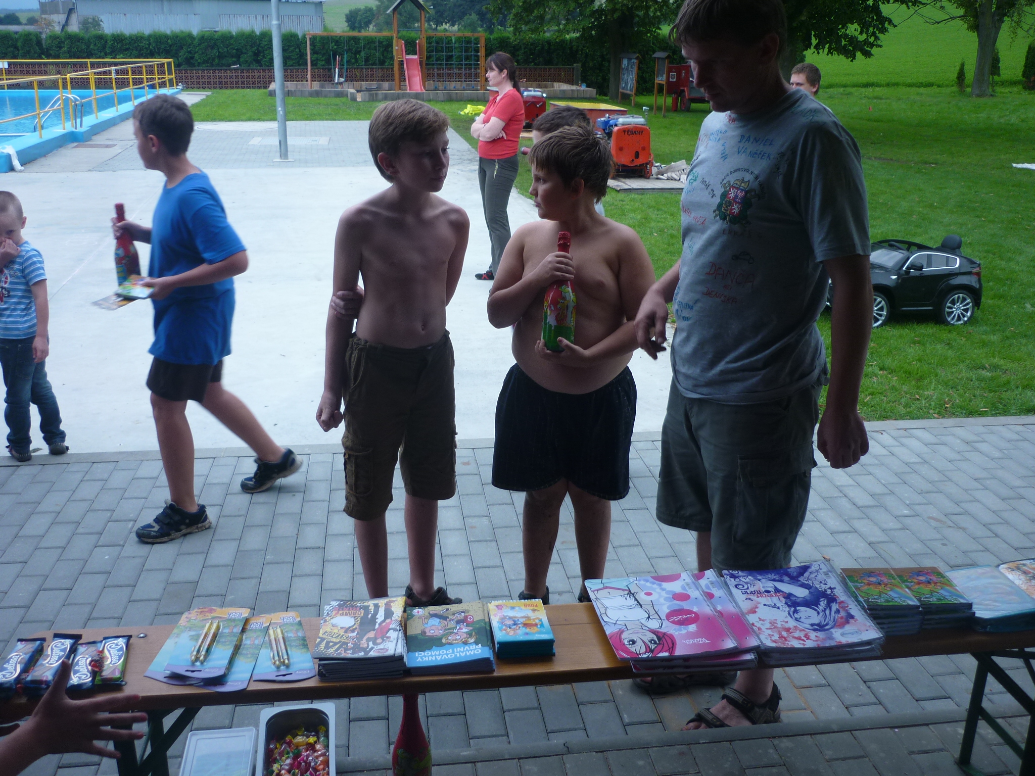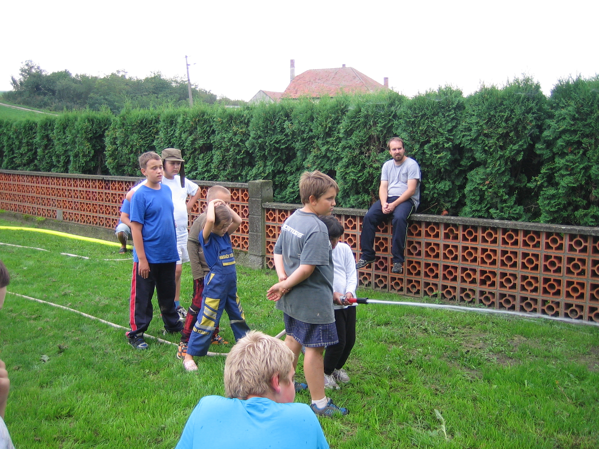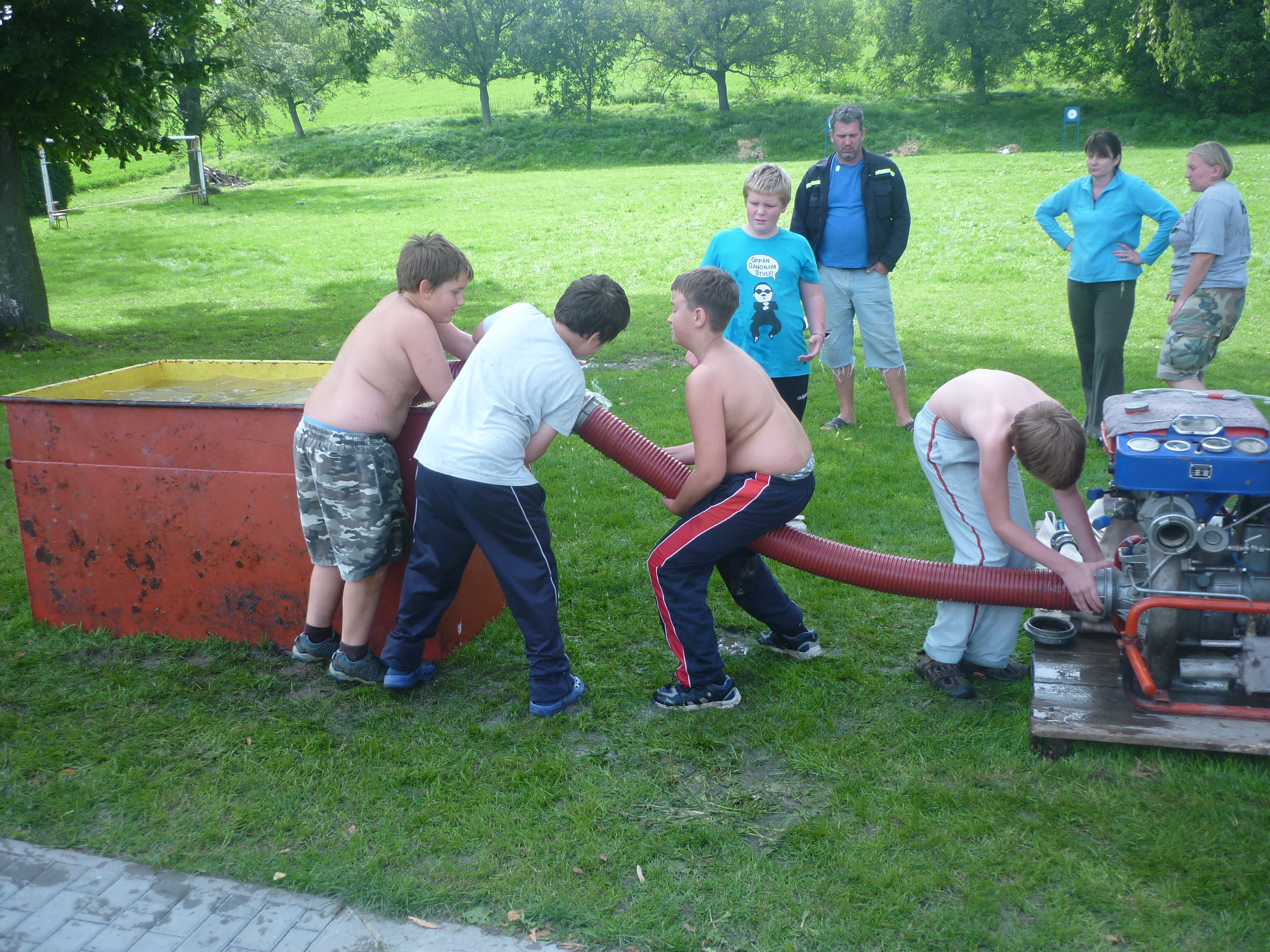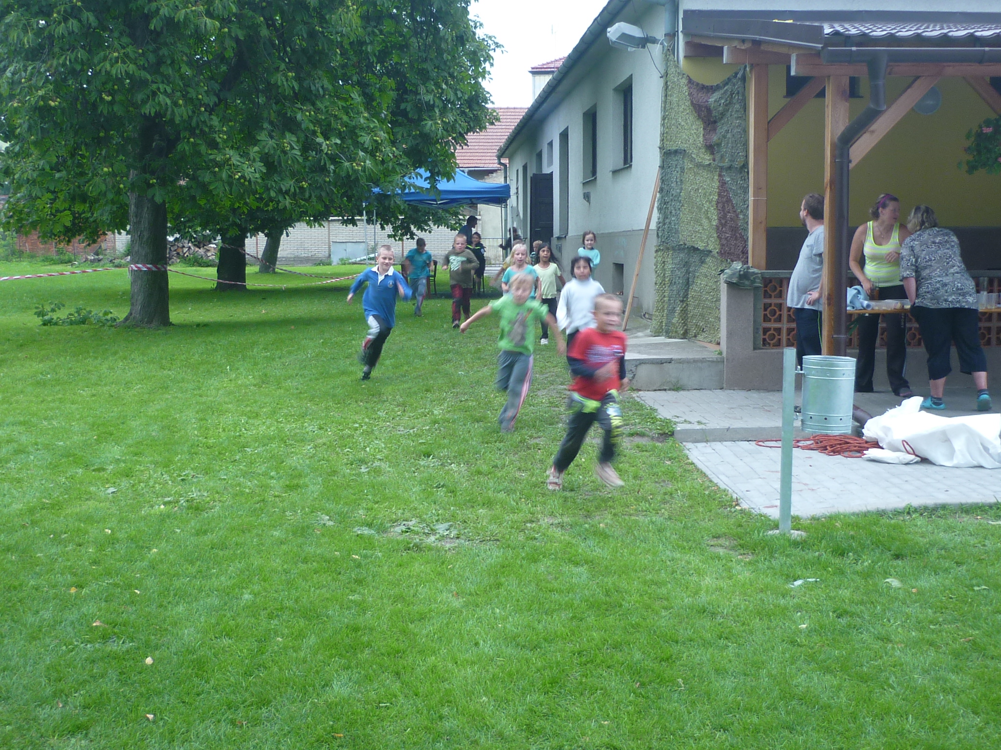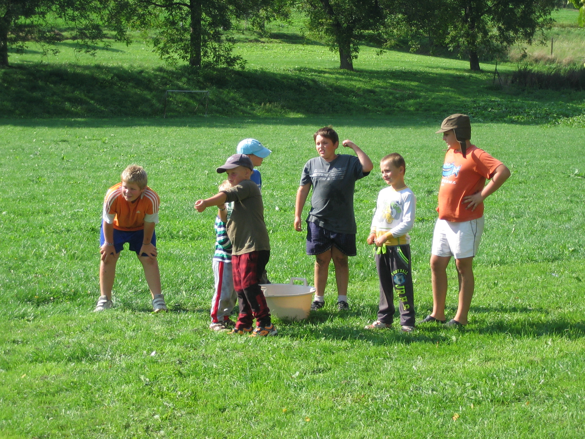 V sobotu - čtvrtý den soustředění - jsme spolu s místními mladými hasiči připravili různé soutěže děti - byl to den rozloučení s prázdninami. Samosebou jsme se soutěží i účastnili. Vyzkoušeli jsme si ještě chůdy, hod na hasiče, hašení domečku, opičí dráhu, závody v pytlích a spousty dalších her. Někteří z nás ale dopoledne trávili trochu jinak - jistě zajímavým výletem po okolí, neboť se museli jen pomocí buzoly vrátit do areálu z místa, kam byli odvezeni se zavázanýma očima. Večerní šou s tancem trochu hatil vytrvalý a hustý déšť, který byl ovšem nádherným tichým doprovodem posledního velkého zážitku soustředění - noční stezky odvahy. Všichni - i ti nejmenší - stezku zvládli na výbornou a sladké odměně v cíli následoval klidný spánek.
