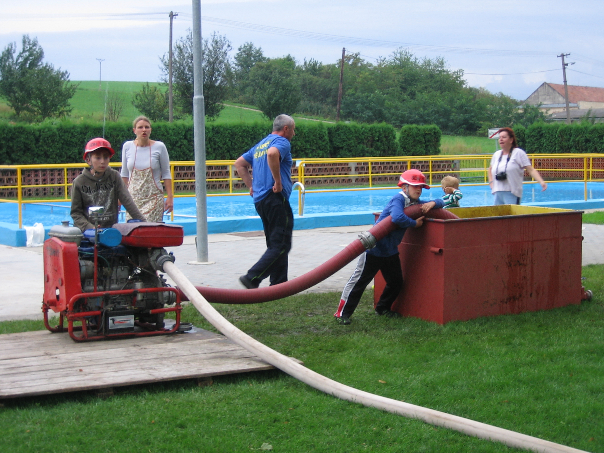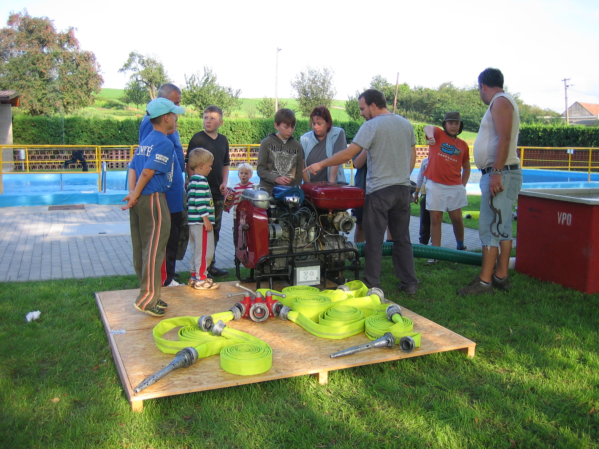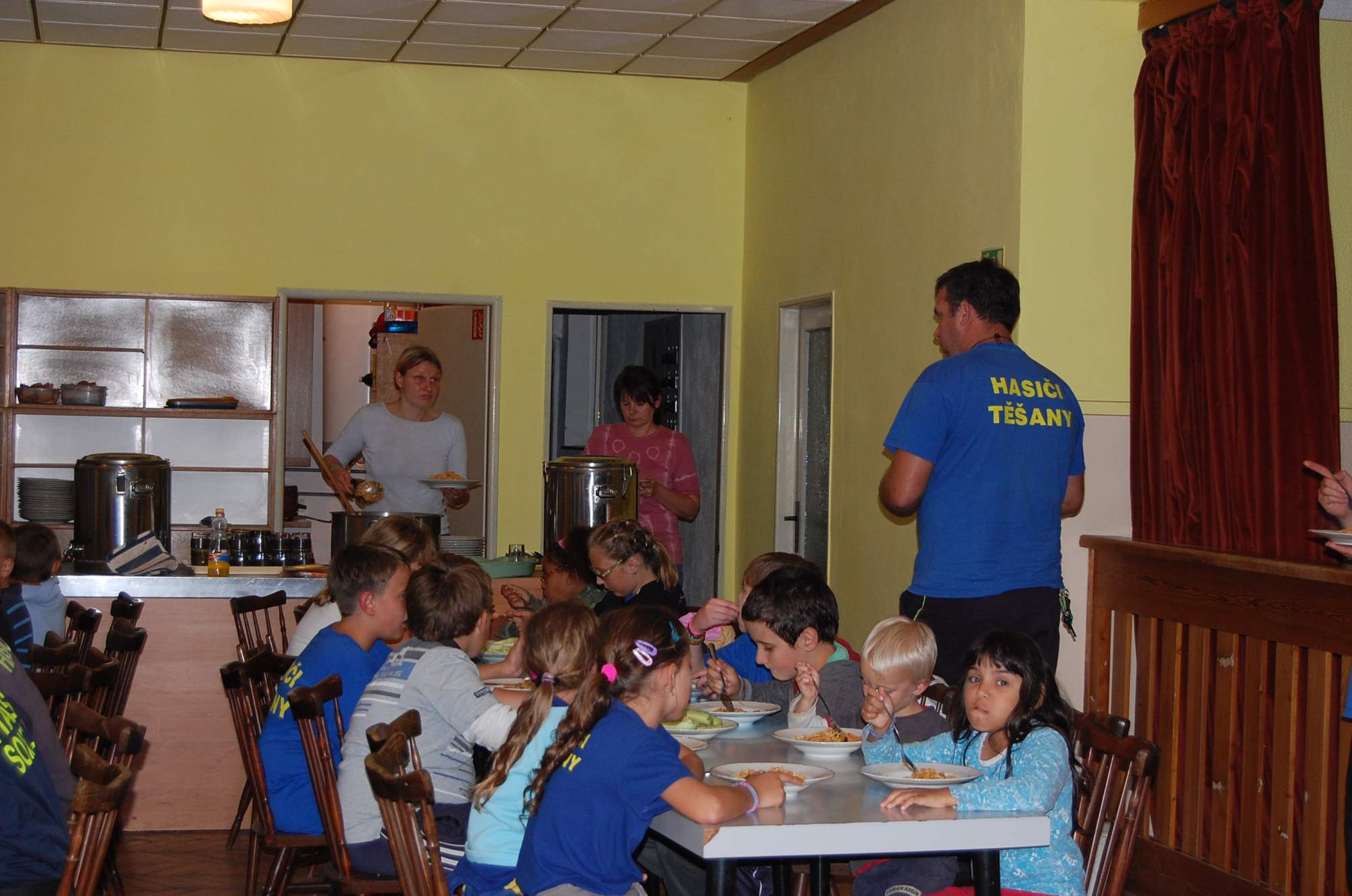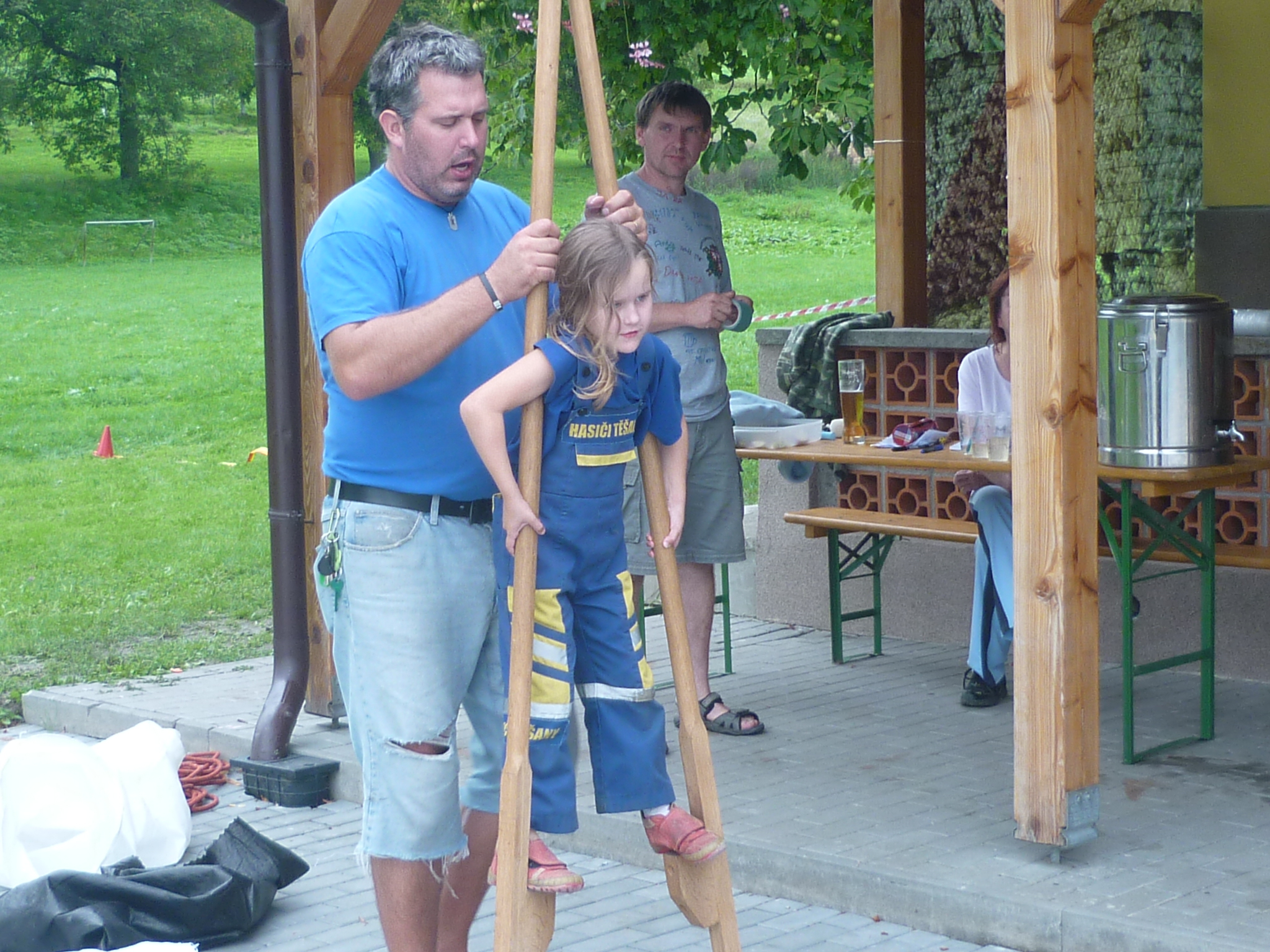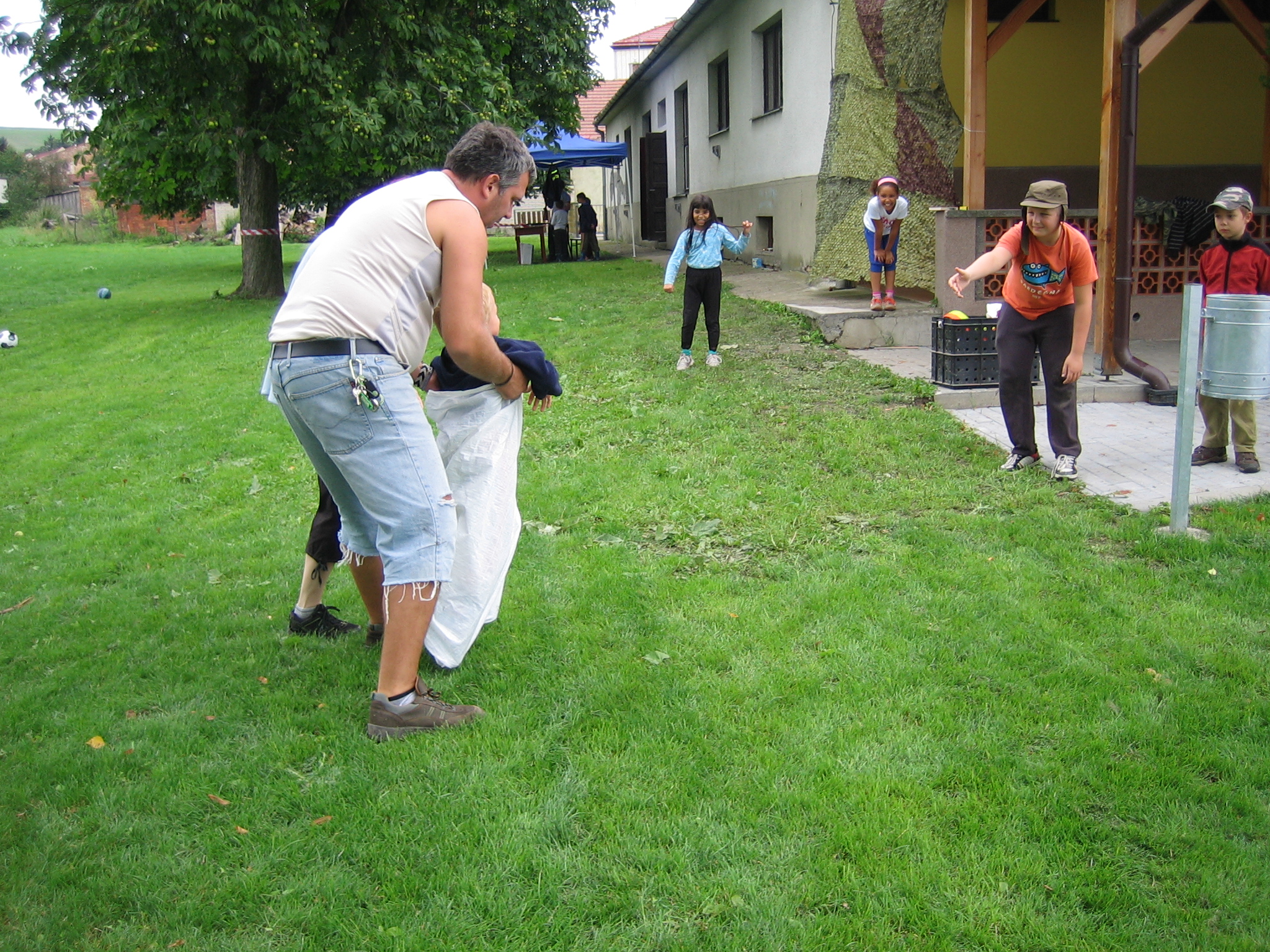 V sobotu - čtvrtý den soustředění - jsme spolu s místními mladými hasiči připravili různé soutěže děti - byl to den rozloučení s prázdninami. Samosebou jsme se soutěží i účastnili. Vyzkoušeli jsme si ještě chůdy, hod na hasiče, hašení domečku, opičí dráhu, závody v pytlích a spousty dalších her. Někteří z nás ale dopoledne trávili trochu jinak - jistě zajímavým výletem po okolí, neboť se museli jen pomocí buzoly vrátit do areálu z místa, kam byli odvezeni se zavázanýma očima. Večerní šou s tancem trochu hatil vytrvalý a hustý déšť, který byl ovšem nádherným tichým doprovodem posledního velkého zážitku soustředění - noční stezky odvahy. Všichni - i ti nejmenší - stezku zvládli na výbornou a sladké odměně v cíli následoval klidný spánek.