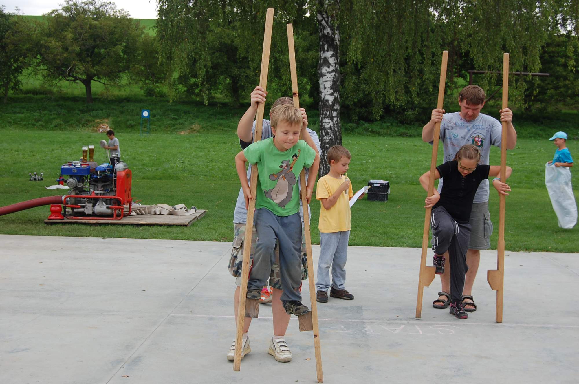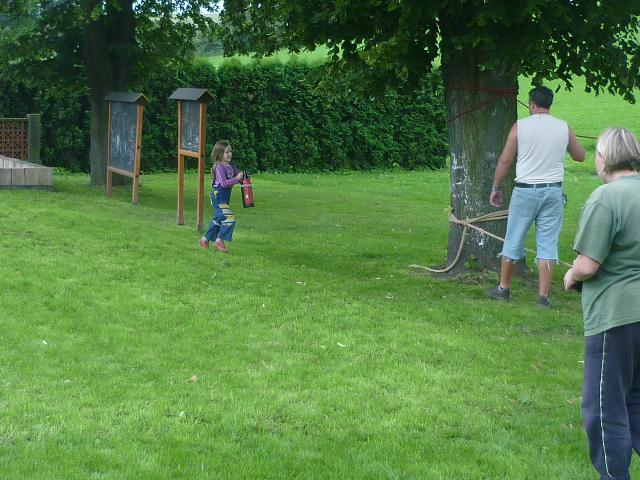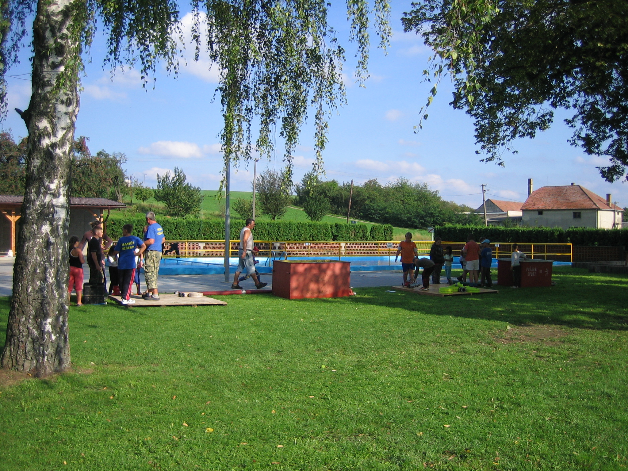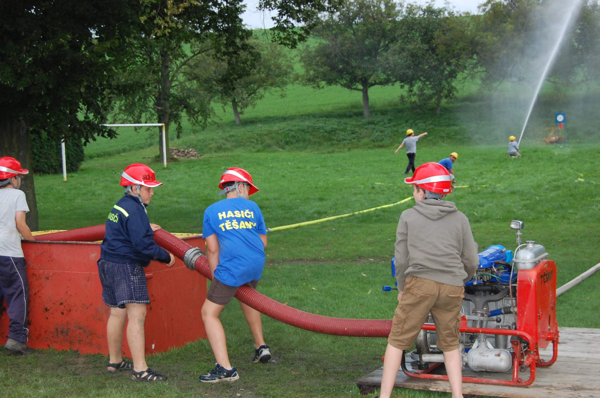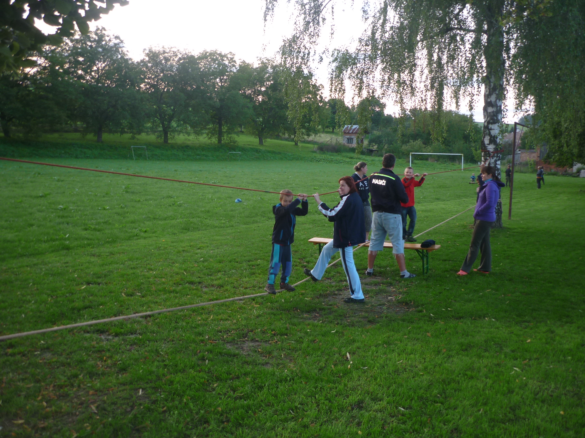 V sobotu - čtvrtý den soustředění - jsme spolu s místními mladými hasiči připravili různé soutěže děti - byl to den rozloučení s prázdninami. Samosebou jsme se soutěží i účastnili. Vyzkoušeli jsme si ještě chůdy, hod na hasiče, hašení domečku, opičí dráhu, závody v pytlích a spousty dalších her. Někteří z nás ale dopoledne trávili trochu jinak - jistě zajímavým výletem po okolí, neboť se museli jen pomocí buzoly vrátit do areálu z místa, kam byli odvezeni se zavázanýma očima. Večerní šou s tancem trochu hatil vytrvalý a hustý déšť, který byl ovšem nádherným tichým doprovodem posledního velkého zážitku soustředění - noční stezky odvahy. Všichni - i ti nejmenší - stezku zvládli na výbornou a sladké odměně v cíli následoval klidný spánek.