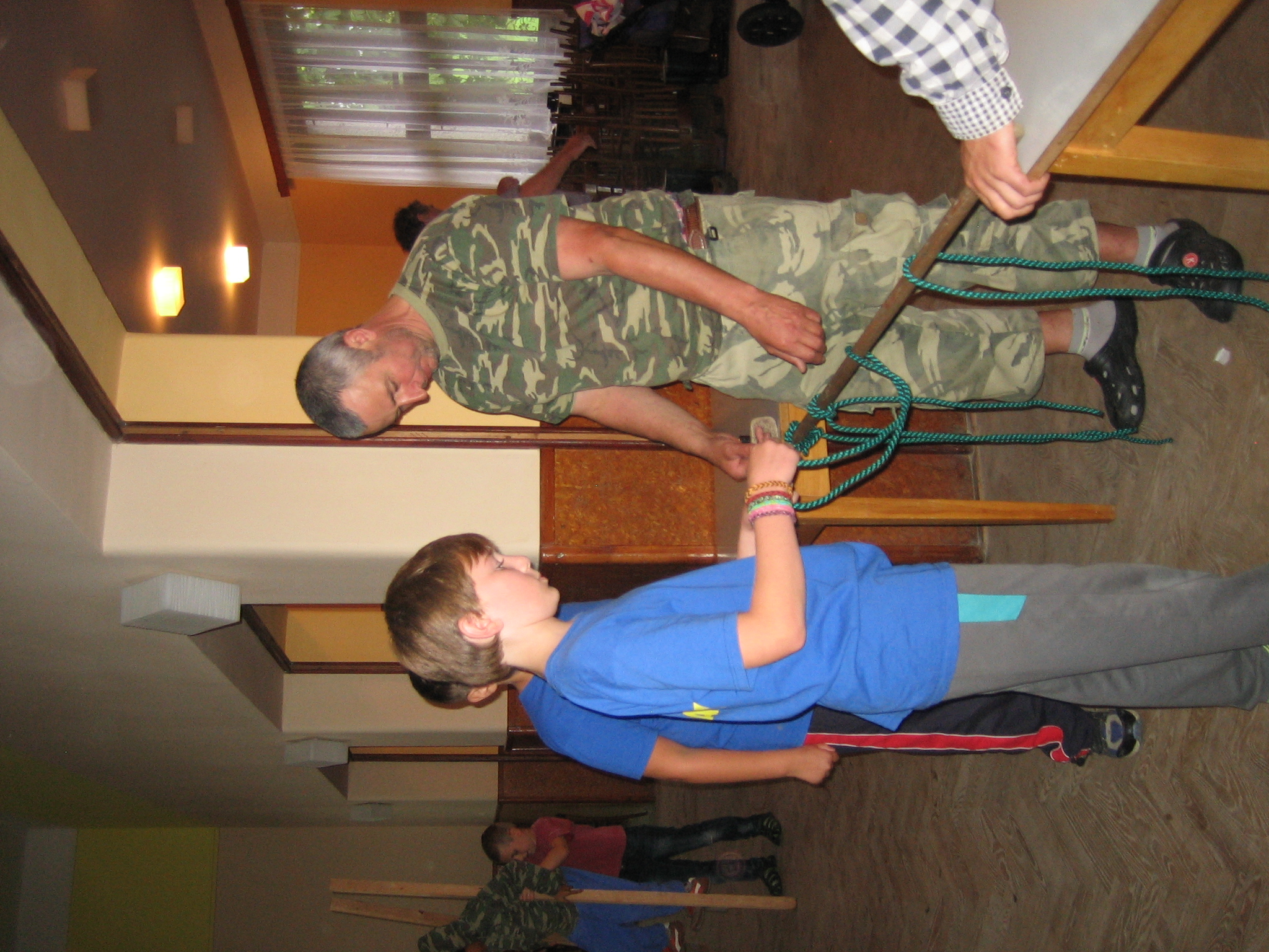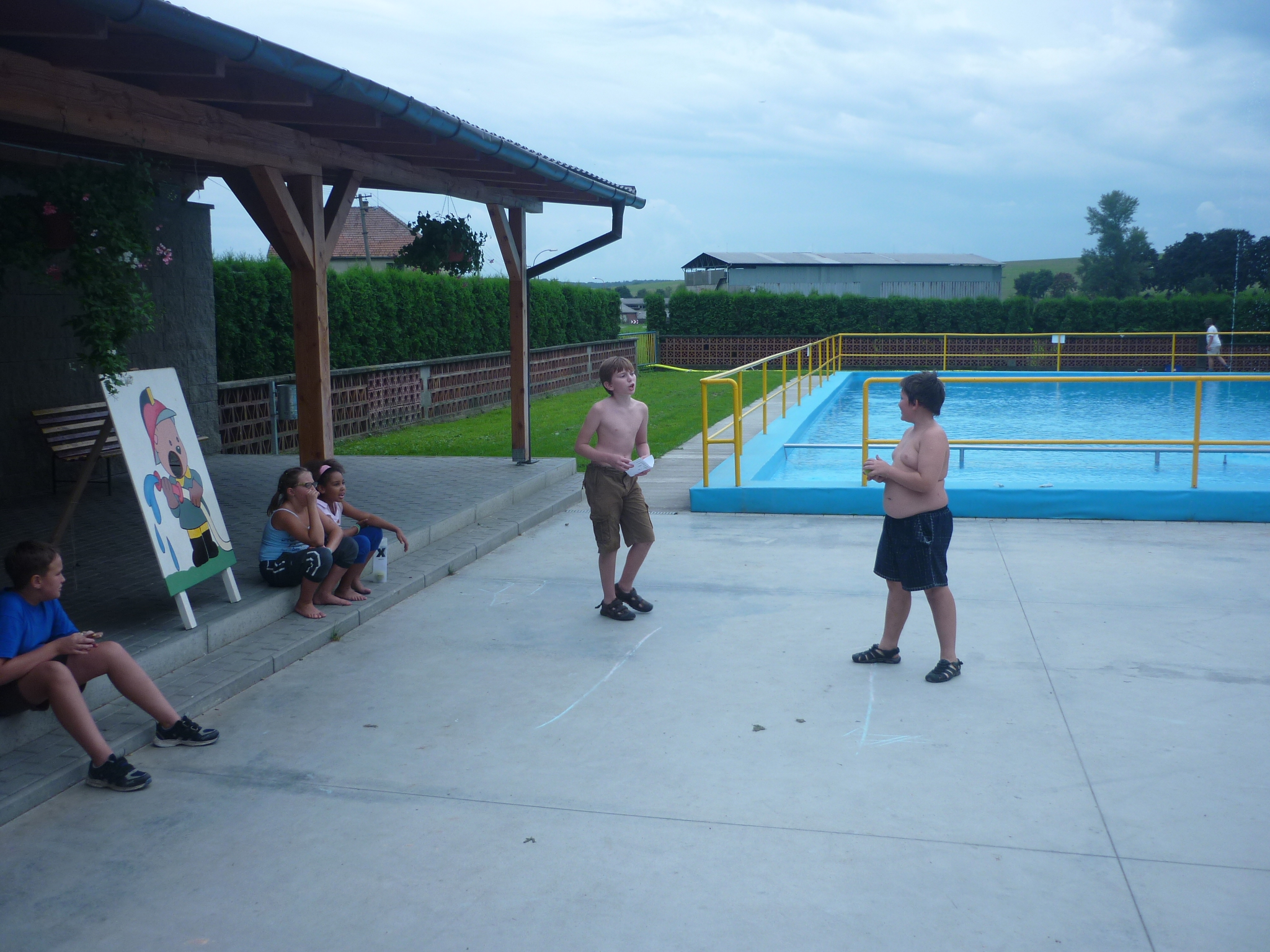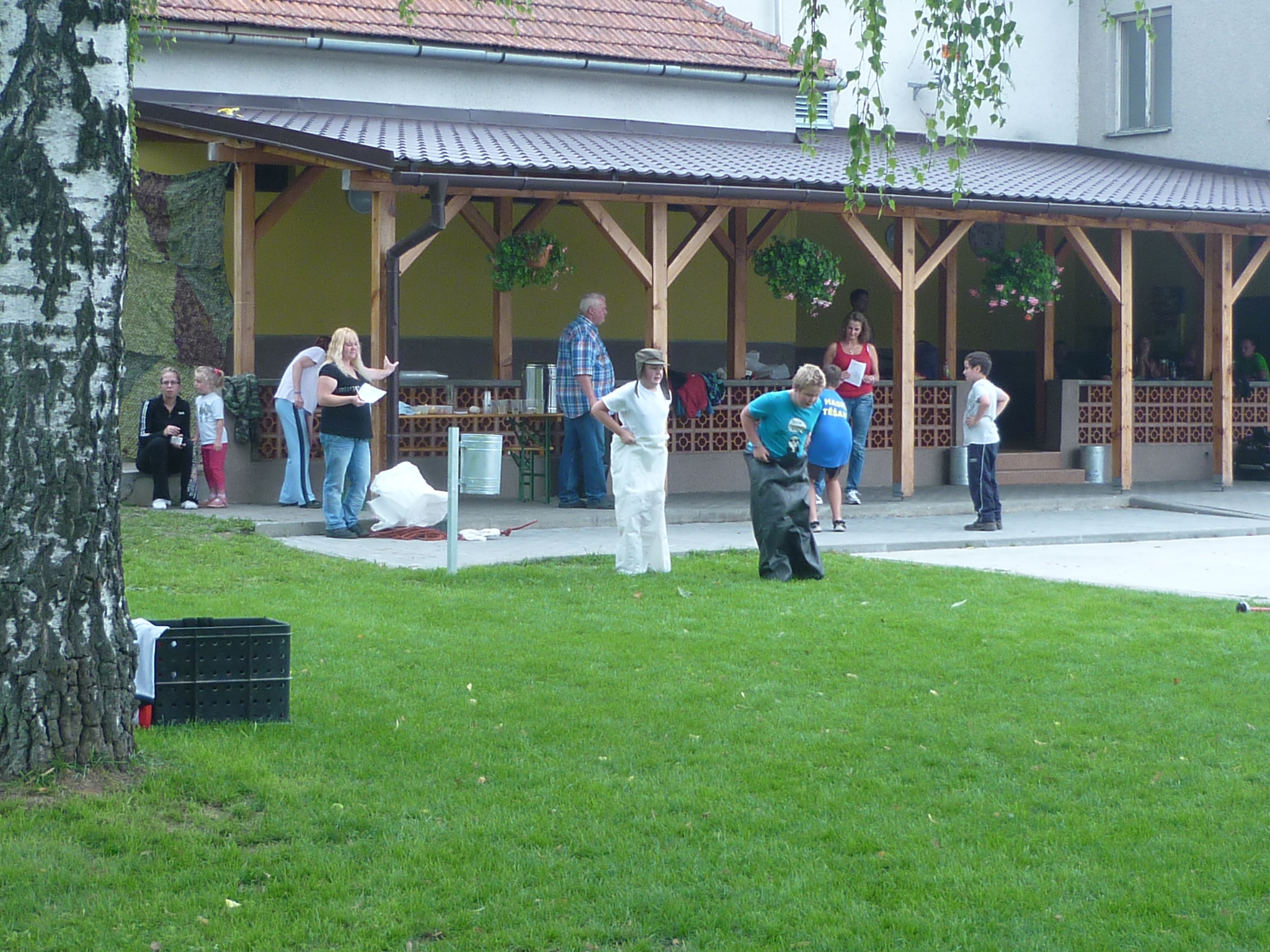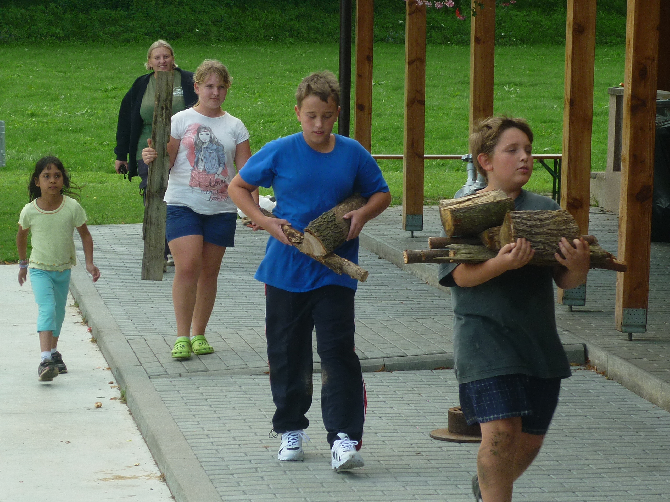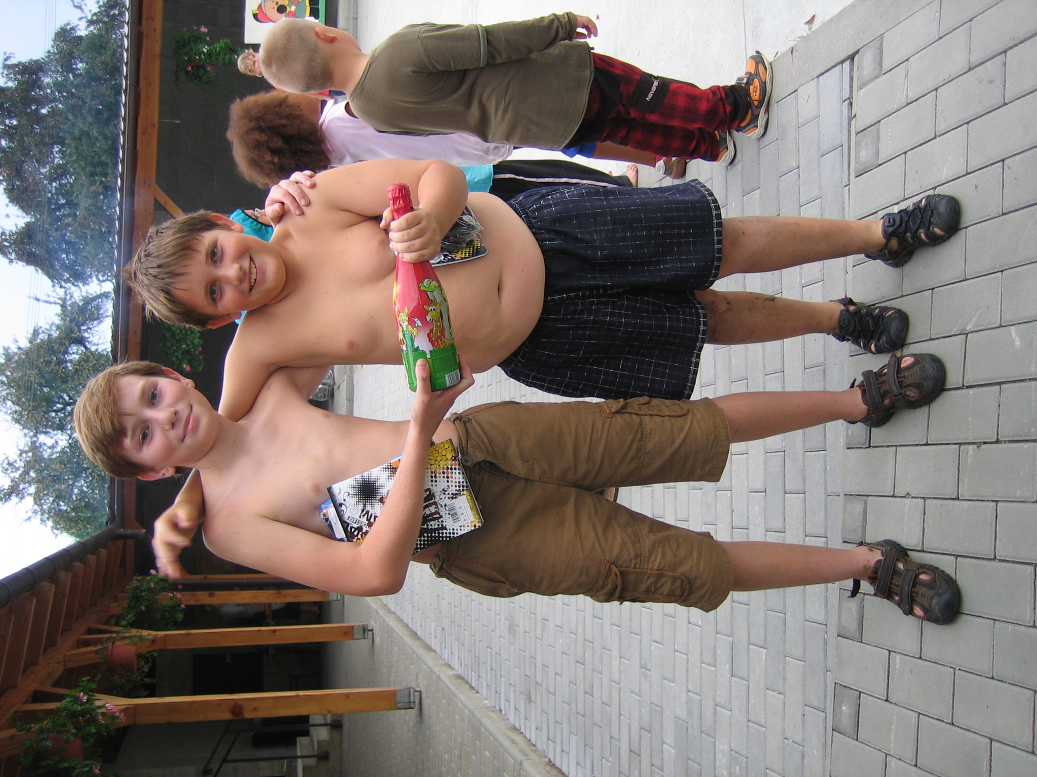 V sobotu - čtvrtý den soustředění - jsme spolu s místními mladými hasiči připravili různé soutěže děti - byl to den rozloučení s prázdninami. Samosebou jsme se soutěží i účastnili. Vyzkoušeli jsme si ještě chůdy, hod na hasiče, hašení domečku, opičí dráhu, závody v pytlích a spousty dalších her. Někteří z nás ale dopoledne trávili trochu jinak - jistě zajímavým výletem po okolí, neboť se museli jen pomocí buzoly vrátit do areálu z místa, kam byli odvezeni se zavázanýma očima. Večerní šou s tancem trochu hatil vytrvalý a hustý déšť, který byl ovšem nádherným tichým doprovodem posledního velkého zážitku soustředění - noční stezky odvahy. Všichni - i ti nejmenší - stezku zvládli na výbornou a sladké odměně v cíli následoval klidný spánek.