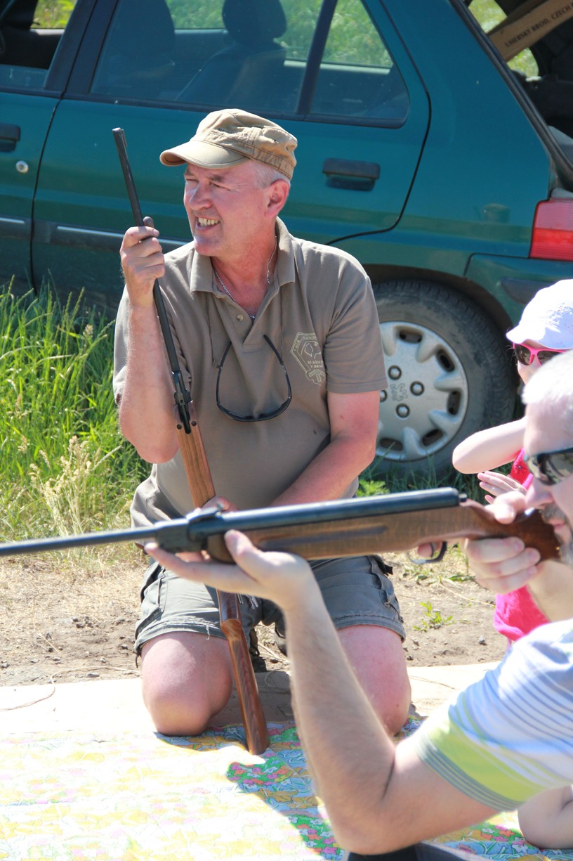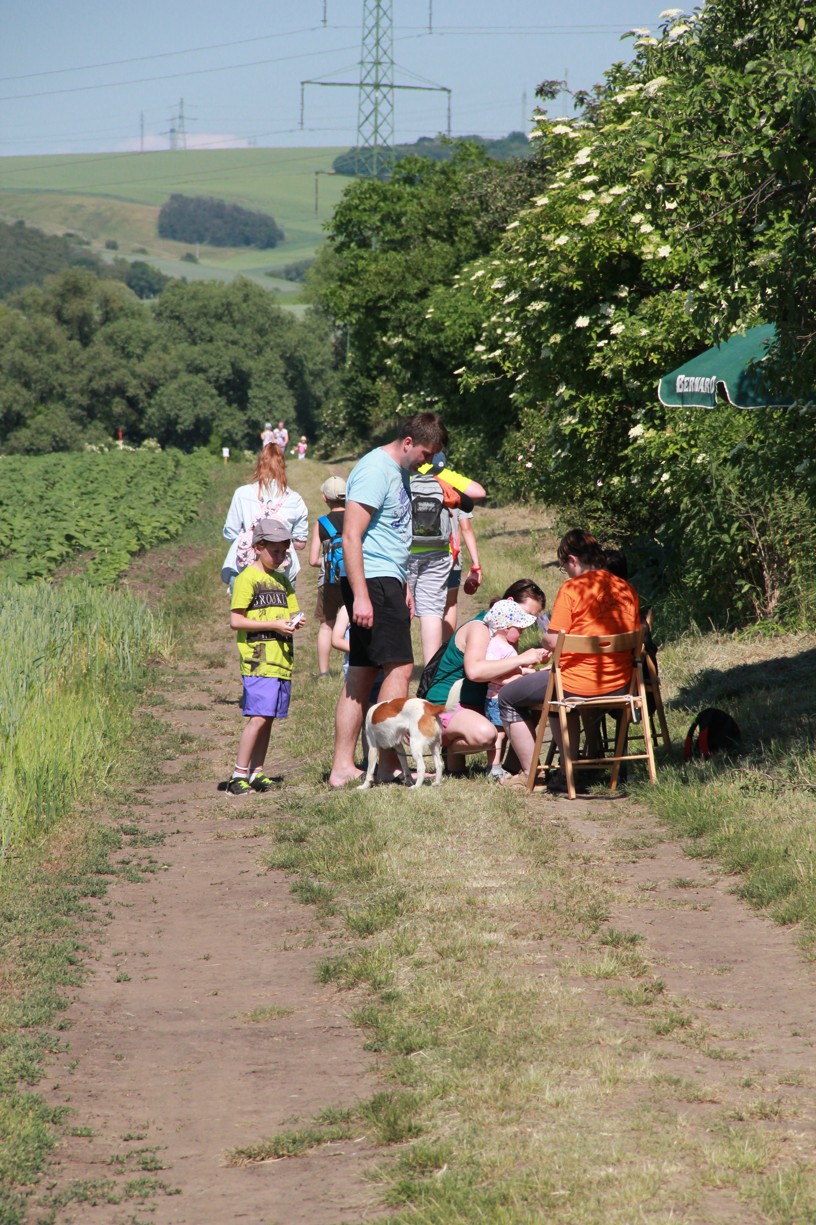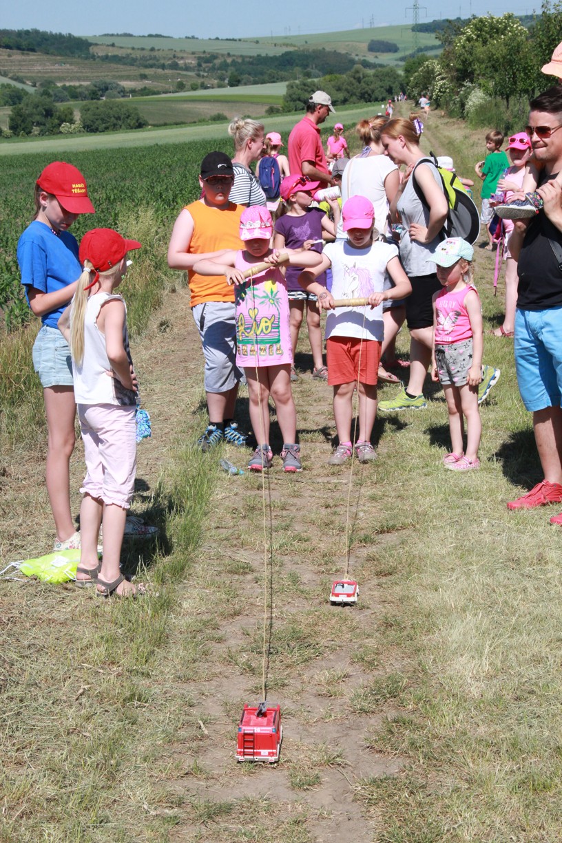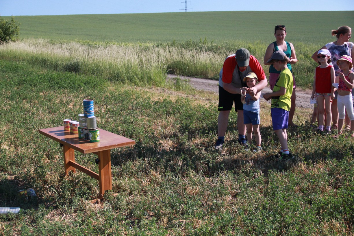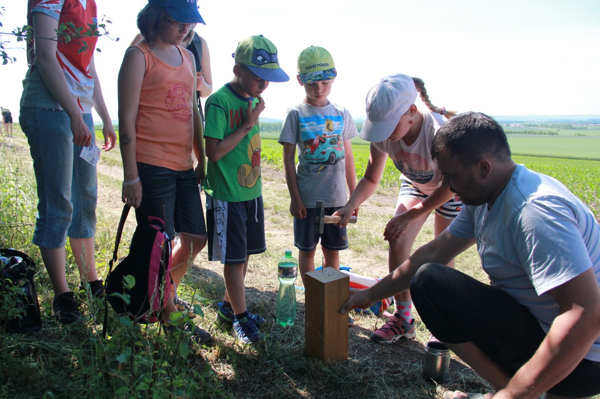 Na dalším stanovišti mladí i starší účastníci docela slušně zatloukají hřebíky na jednu ránu. Jinde zase poznávají stopy zvěře, nejmenší se učí pojmenovat naše divoká zvířátka. Trénujeme paměť, uzlujeme o sto šest. Nakonec i ten skok v pytli není tak špatný. Užijeme si maskované zranění, které vypadá tak opravdově, že některé maminky (i tatínkové) raději koukají přes pole na Těšany. Je tu přeci jen krásně. Jsem rád, že se tolik nadšených duší v sobotu po obědě vydalo na procházku užít si právě tenhle výhled.