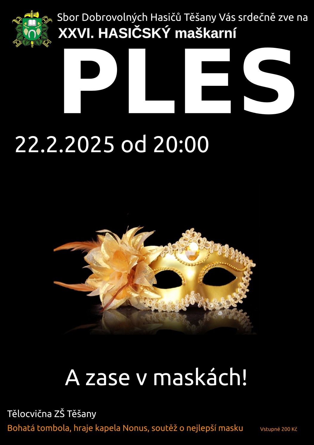 Zveřejněno 31.01.2025Sbor dobrovolných hasičů Těšany si vás dovoluje srdečně pozvat na svůj XXV. ostatkový maškarní ples. Vítány jsou masky všeho druhu, skvělá hudba, občerstvení a příjemná zábava dlouho do noci zaručena!
