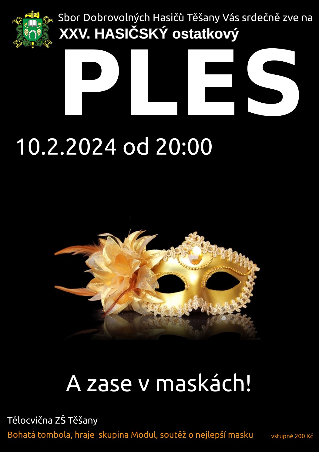 Zveřejněno 28.01.2024Sbor dobrovolných hasičů Těšany si vás dovoluje srdečně pozvat na svůj XXV. ostatkový maškarní ples. Vítány jsou masky všeho druhu, skvělá hudba, občerstvení a příjemná zábava dlouho do noci zaručena!
