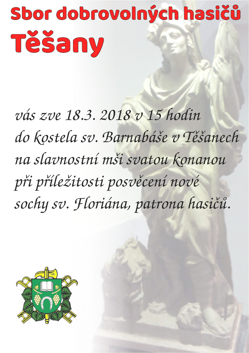 Zveřejněno 05.03.2018Sbor dobrovolných hasičů v Těšanech si vás dovoluje pozvat na slavnostní mši konanou ku příležitosti svěcení sochy sv. Floriána - patrona hasičů - konanou 18.3.2018 v 15 hodin do kostela sv. Barnabáše v Těšanech.