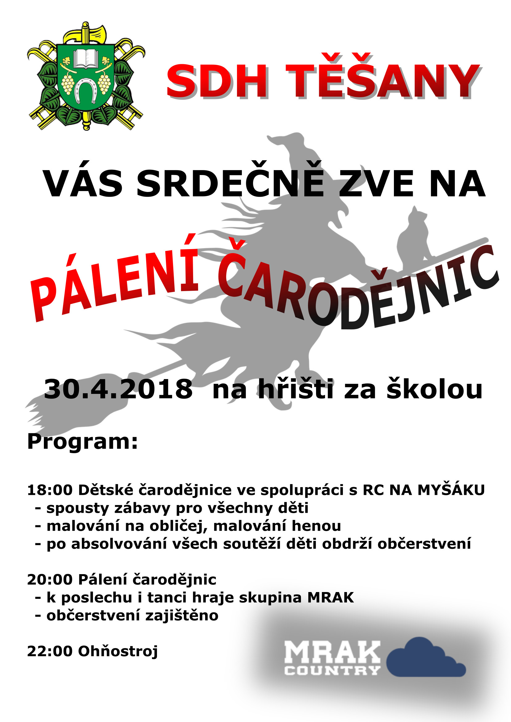 Zveřejněno 23.04.2018SDH Těšany vás zvou na pálení čarodějnic! I letos je ve spolupráci s RC NA MYŠÁKU přichystaná spousta soutěží, za které si děti vysoutěží drobné občerstvení.