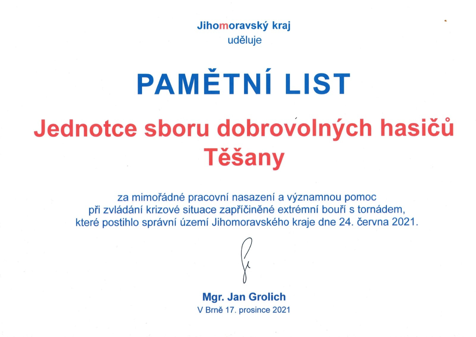 Zveřejněno 08.01.2022Obdrželi jsme poděkování a pamětní list JMK od hejtmana Jana Grolicha. Jsme rádi že nejsme bráni jako samozřejmost, že je naše práce oceněna. Pro nás všechny je touha po pomoci bližnímu absolutně jasná a je naplňující jet tam kde můžeme jakkoliv pomoci. Poděkování si tak zaslouží hlavně naše rodiny a všichni známí, kteří nám náš "koníček" tolerují :-)