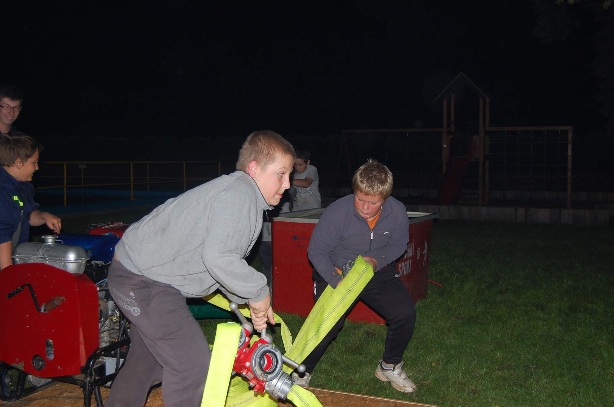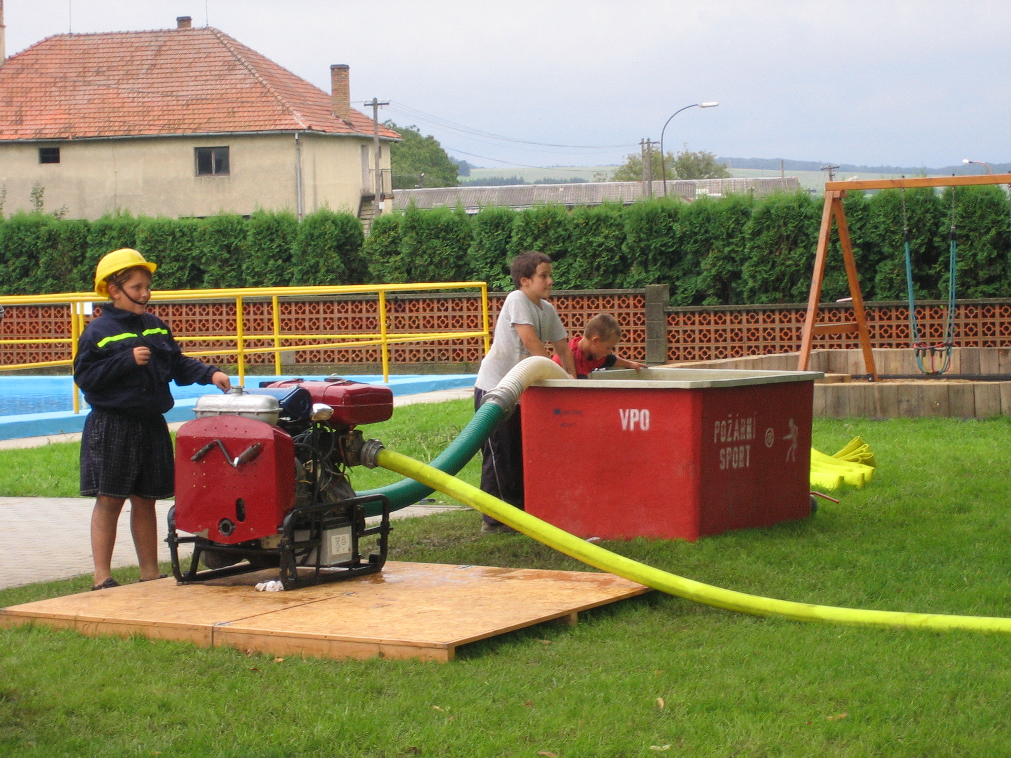 V sobotu - čtvrtý den soustředění - jsme spolu s místními mladými hasiči připravili různé soutěže děti - byl to den rozloučení s prázdninami. Samosebou jsme se soutěží i účastnili. Vyzkoušeli jsme si ještě chůdy, hod na hasiče, hašení domečku, opičí dráhu, závody v pytlích a spousty dalších her. Někteří z nás ale dopoledne trávili trochu jinak - jistě zajímavým výletem po okolí, neboť se museli jen pomocí buzoly vrátit do areálu z místa, kam byli odvezeni se zavázanýma očima. Večerní šou s tancem trochu hatil vytrvalý a hustý déšť, který byl ovšem nádherným tichým doprovodem posledního velkého zážitku soustředění - noční stezky odvahy. Všichni - i ti nejmenší - stezku zvládli na výbornou a sladké odměně v cíli následoval klidný spánek.