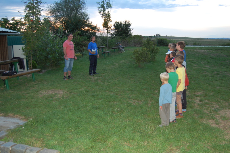 V podvečer dorazili mladí hasiči konečeně do vytouženého cíle – přes Viničné Šumice do Kovalovic. V Kovalovicích tak trochu neplánovaně zjistili jsme jaká je voda v báječném prostoru biotopu, který je takřka z brusu nový. A konečně jsme se chystali do postýlek. Nocležiště jsme tentokráte měli v kovalovické hasičské stanici, kterou nám na noc místní zapůjčili. Moc děkujeme! Areál biotopo se nám tak líbil, že jsme v něm nakonec trávili ještě i celé nedělní dopoledne. Počasí bylo báječné a voda krásně teplá, takže jsme se do koupele vrhli snad všichni. Po návratu do Nesvačilky se k nám přidal poslední zbytek osazenstva, vybalili jsme a ještě trochu odpočívali po náročném pochodu. Večer nás čekal ještě neobvyklý úkol. Se zavázanýma očima postupně všechny mladé hasiče vedoucí odvezli na tajné místo. Cestou probíhala zuřivá debata ohledně práce s buzolou a nočním návratem do Nesvačilky a zda je obutí dostatečné do terénu. Jaké bylo překvapení, když se šátek z očí sundal a děti stály v Těšanech na hasičce a před sebou uviděli sprchu, mýdlo a ručník. Celá noc proběhla v klidném a hlubokém spánku.
