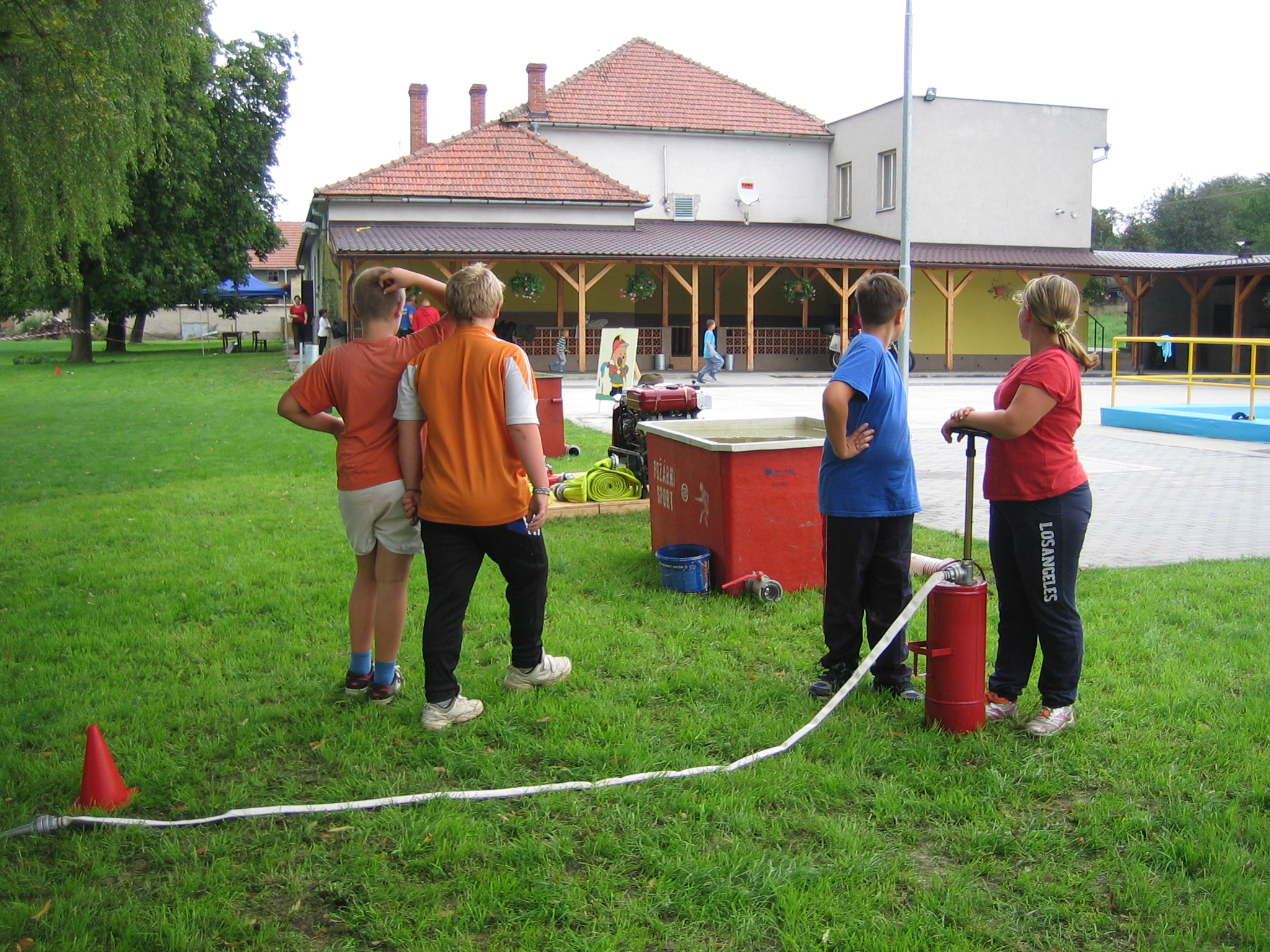 V sobotu - čtvrtý den soustředění - jsme spolu s místními mladými hasiči připravili různé soutěže děti - byl to den rozloučení s prázdninami. Samosebou jsme se soutěží i účastnili. Vyzkoušeli jsme si ještě chůdy, hod na hasiče, hašení domečku, opičí dráhu, závody v pytlích a spousty dalších her. Někteří z nás ale dopoledne trávili trochu jinak - jistě zajímavým výletem po okolí, neboť se museli jen pomocí buzoly vrátit do areálu z místa, kam byli odvezeni se zavázanýma očima. Večerní šou s tancem trochu hatil vytrvalý a hustý déšť, který byl ovšem nádherným tichým doprovodem posledního velkého zážitku soustředění - noční stezky odvahy. Všichni - i ti nejmenší - stezku zvládli na výbornou a sladké odměně v cíli následoval klidný spánek.