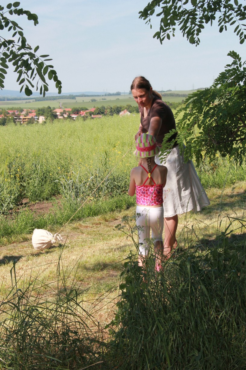 Na dalším stanovišti mladí i starší účastníci docela slušně zatloukají hřebíky na jednu ránu. Jinde zase poznávají stopy zvěře, nejmenší se učí pojmenovat naše divoká zvířátka. Trénujeme paměť, uzlujeme o sto šest. Nakonec i ten skok v pytli není tak špatný. Užijeme si maskované zranění, které vypadá tak opravdově, že některé maminky (i tatínkové) raději koukají přes pole na Těšany. Je tu přeci jen krásně. Jsem rád, že se tolik nadšených duší v sobotu po obědě vydalo na procházku užít si právě tenhle výhled.