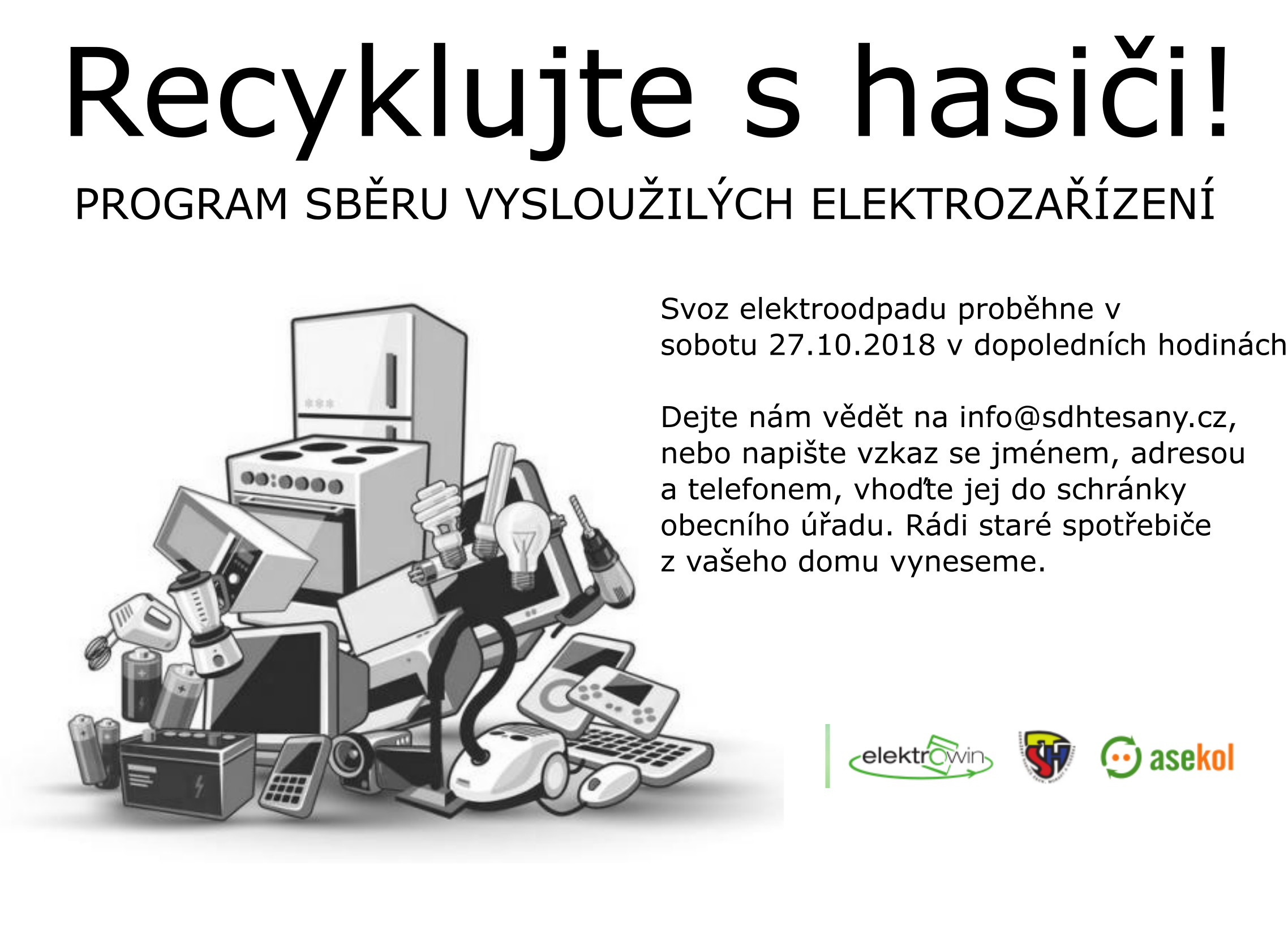 Zveřejněno 22.10.2018V sobotu 27.10.2018 proběhne v Těšanech svoz elektroodpadu. Nepotřebné spotřebiče prosíme nechte buď před domem, nebo nám napište na adresu info@sdhtesany.cz případně napište vzkaz s vaším jménem, adresou a telefonem a vhoďte jej do schránky obecního úřadu.
