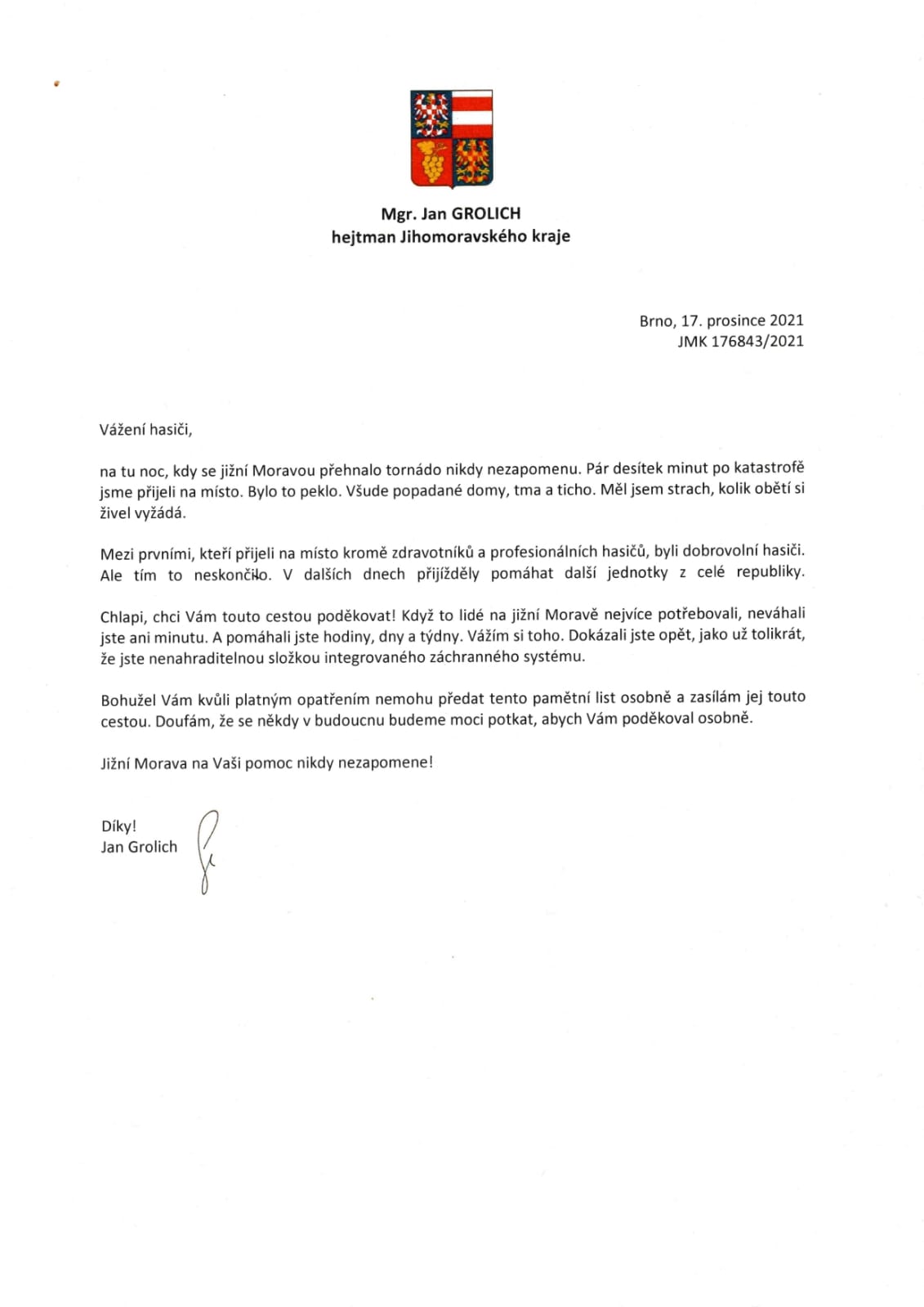 Zveřejněno 08.01.2022Obdrželi jsme poděkování a pamětní list JMK od hejtmana Jana Grolicha. Jsme rádi že nejsme bráni jako samozřejmost, že je naše práce oceněna. Pro nás všechny je touha po pomoci bližnímu absolutně jasná a je naplňující jet tam kde můžeme jakkoliv pomoci. Poděkování si tak zaslouží hlavně naše rodiny a všichni známí, kteří nám náš "koníček" tolerují :-)